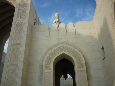 Hari ketiga, pusing keliling cari kedai kasut...tapak kasut anak aku dah tercabut...memang tak jumpa sebab pagi-pagi kedai banyak tak buka lagi. Satu lagi tempat yang agak menarik untuk dikunjungi di Muscat, ialah Masjid Besar Sultan Qaboos..Kawasannya sangat luas dan di kelilingi taman dan kolam air pancut..Kalau azan baru nak mula masuk kawasan pagar, sampai ke ruang solat mungkin dah habis solat. Nak beritahu luasnya kawasan masjid..Aku pun pusing-pusing kawasan masjid tenguk seni bina dan lanskap yang sangat cantik. Rasa macam dalam syurga dah....Masa'allah..Anak aku yang kecik sekali tanya..Ayah ni masjid akhir zaman ke?...Wallahua"lam...Masjidnya sangat besar tetapi yang datang berjamaah sangat sedikit..Kebetulan masa aku sampai baharu azan asar. Dikatakan masjid ini boleh menampung 20,000 jamaah dan luasnya meliputi 416,000 meter persegi. Terdapat lima menara yang tinggi. Terdapat sebuah perpustakaan yang menempatkan lebih 20,000 buku dalam pelbagai bidang.