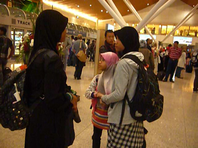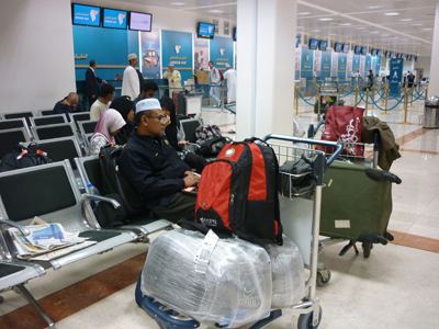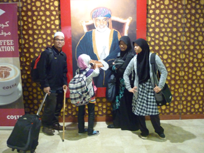 Menjelang petang terus bertolak ke airport Muscat...solat maghrib di Masjid kecil sebelah airport..barulah nampak masjid penuh..Lepas tu check in dan masuk semula ke dalam perut Oman Air menuju ke KLIA. Sepanjang aku di Oman seorang pun aku tak jumpa muka melayu..di sana. Dijangka sampai di KLIA jam 8.00 pagi waktu Malaysia. Ini bermakna aku akan solat subuh dalam kapal terbang...Teringat aku tulisan Dr. Zaharudin, sebenarnya kalau nak solat macam biasa dalam kapal terbang pun boleh. Bila masuk waktu subuh, aku ambil whudu' siap-saip dalam bilik air, tenguk arah qiblat dalam screen depan tempat duduk, lepas tu aku pergi jumpa paramugari yang duduk di kabin belakang..Aku tanya boleh tak nak solat. Dengan senang hati mereka bagi aku ruang untuk solat siap lapik dengan selimut bersih..Lepas tu aku pun suruh isteri dan anak-anak aku solat di ruangan itu..Sebenarnya di mana-mana kalau nak solat senang je....Alhamdulillah...Lebih kurang jam, 8.00 pagi kami pun sampai di KLIA, Alhamdulillah selamat kembali ke bumi Malaysia...